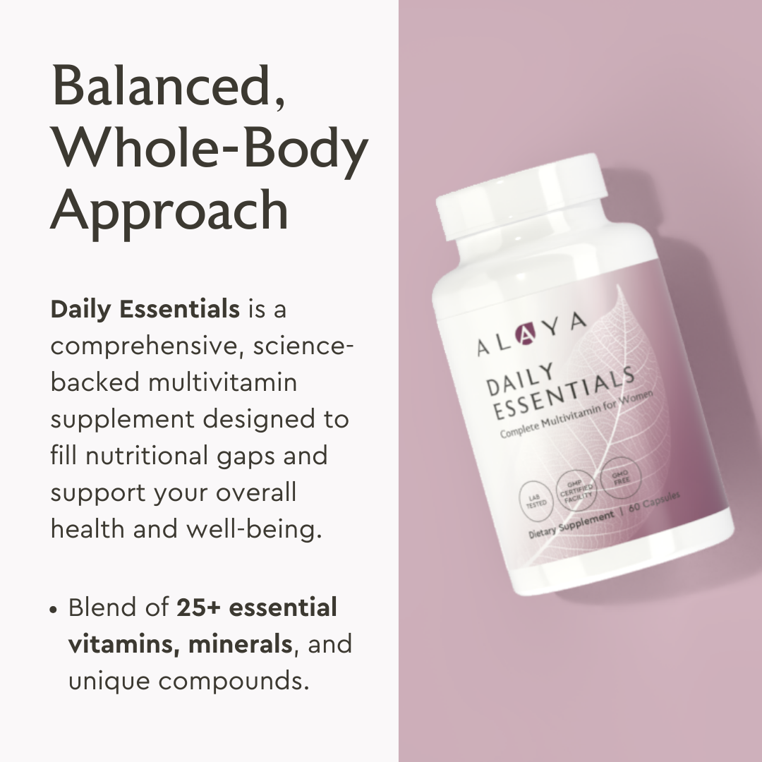 • Daily Essentials Multivitamin is a comprehensive, science-backed supplement designed to fill nutritional gaps and support your overall health and well-being with a potent blend of essential vitamins, minerals, and unique nutrients.