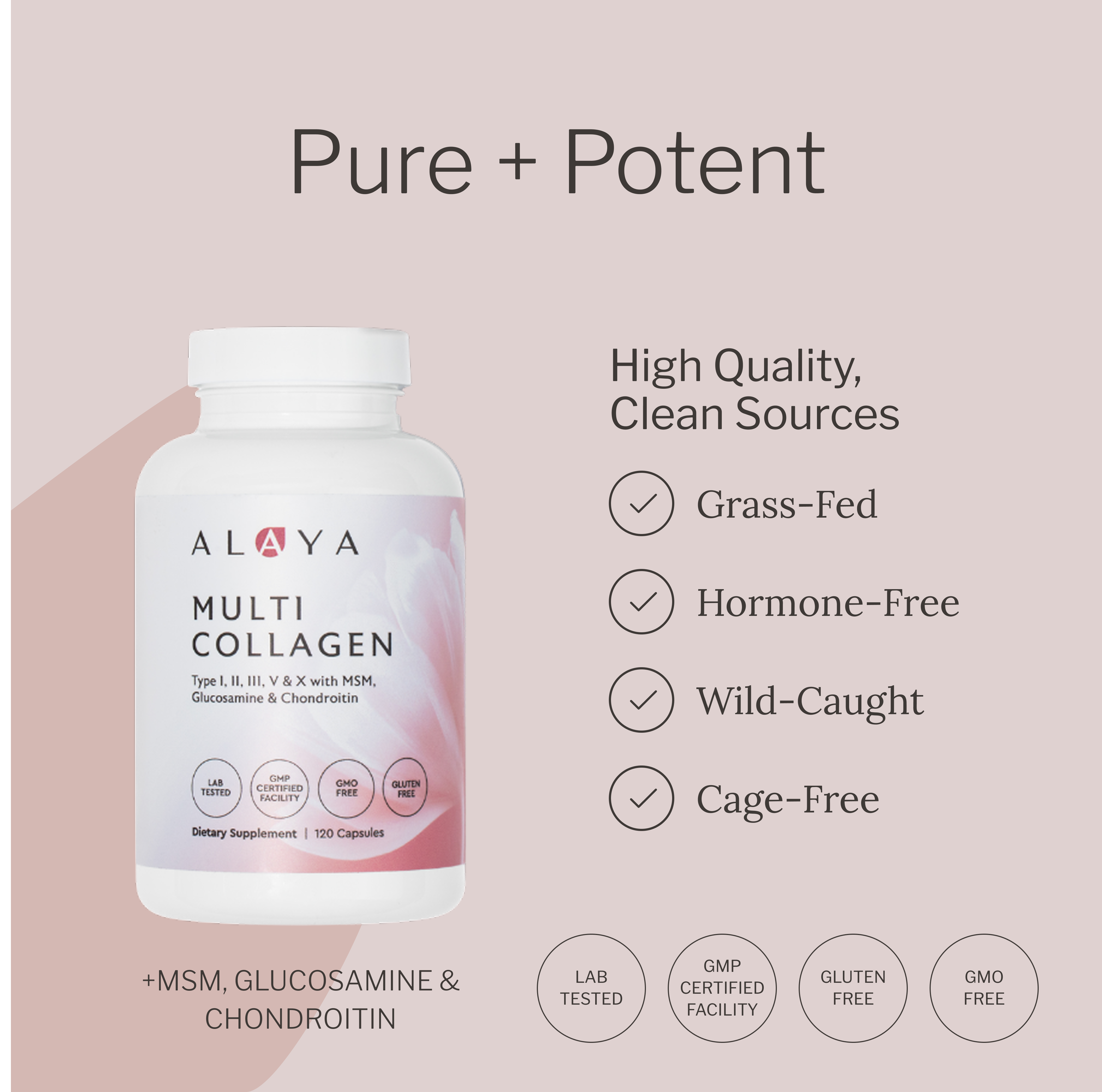 • Now available in capsule form—Alaya Collagen is a multi-source collagen peptide blend of types I, II, III, V and X that contains the highest quality chicken, fish, bovine and egg collagen in addition to our proprietary hair, skin, and joint support blend.